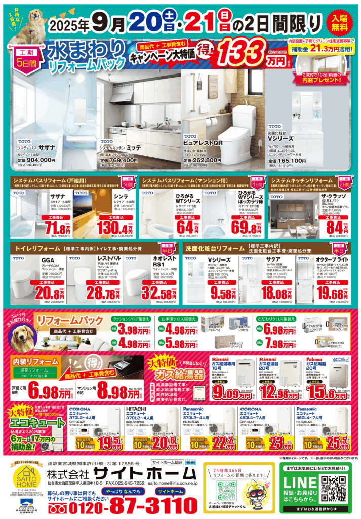 2025年9月20日(土)・21日(日)の2日間限定でTOTOショールーム仙台にてリフォームフェアを開催します!