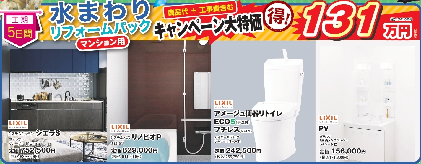 商品代+工事費込みのキャンペーン大特価水まわりリフォームパック!